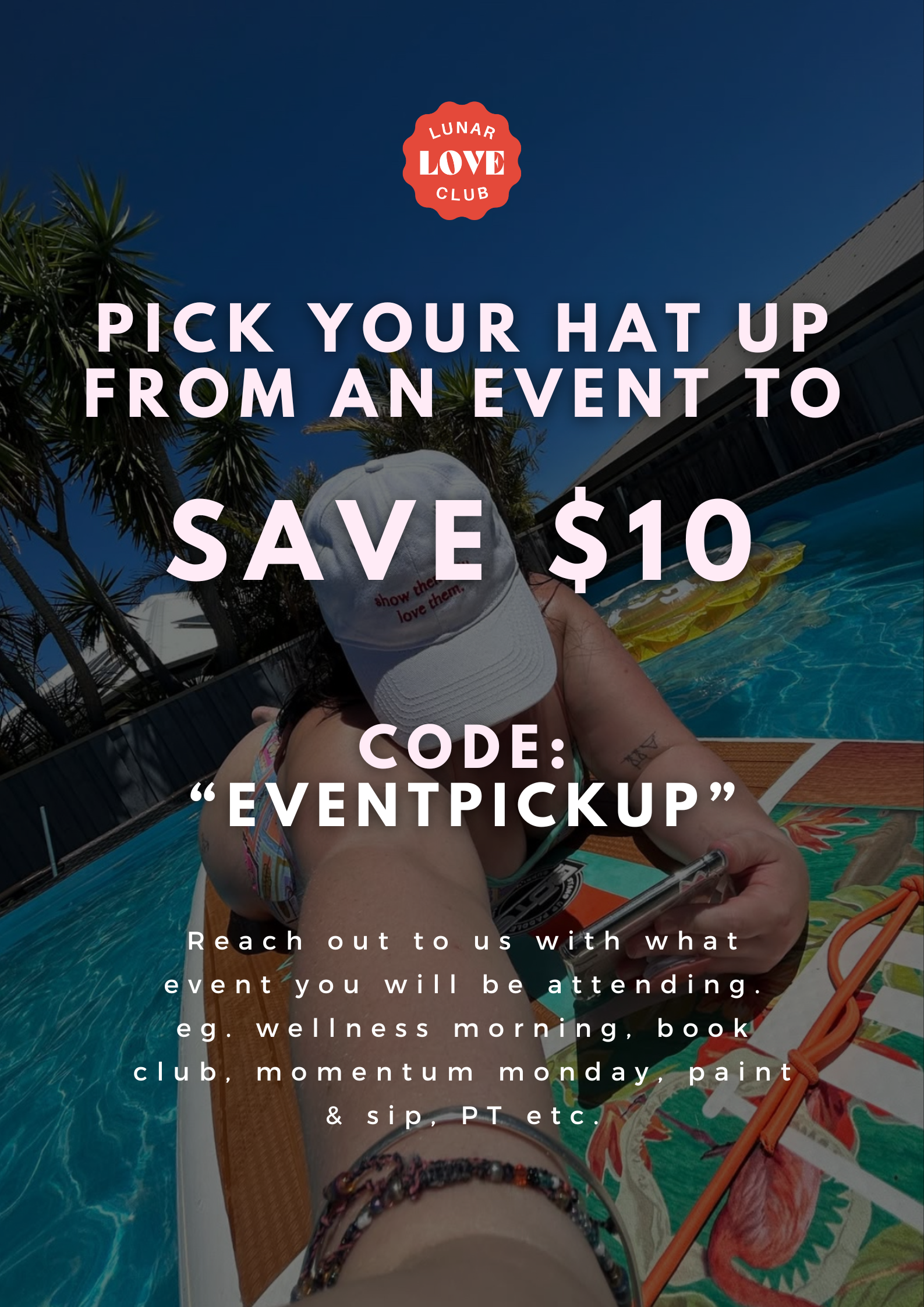 USE CODE "EVENTPICKUP" to save $10 ad collect your hat from an upcoming event. Events include: Momentum Monday, Wellness Morning, Book Club, Paint and Sip, PT, etc